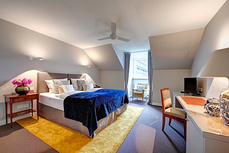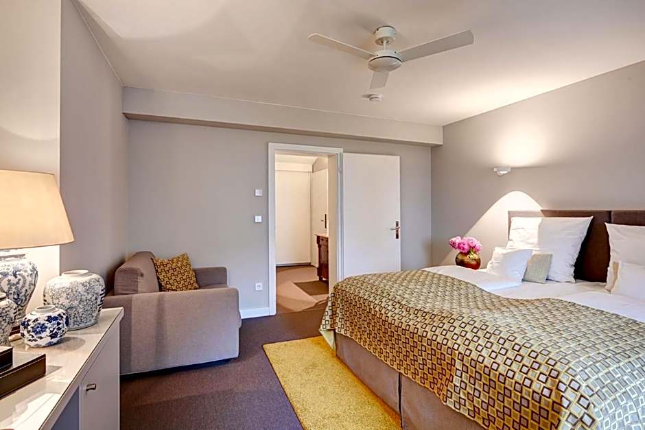 Elegant suite featuring separate sleeping and living areas, a walk-in wardrobe, satellite TV, and a bathroom with a bath tub.
